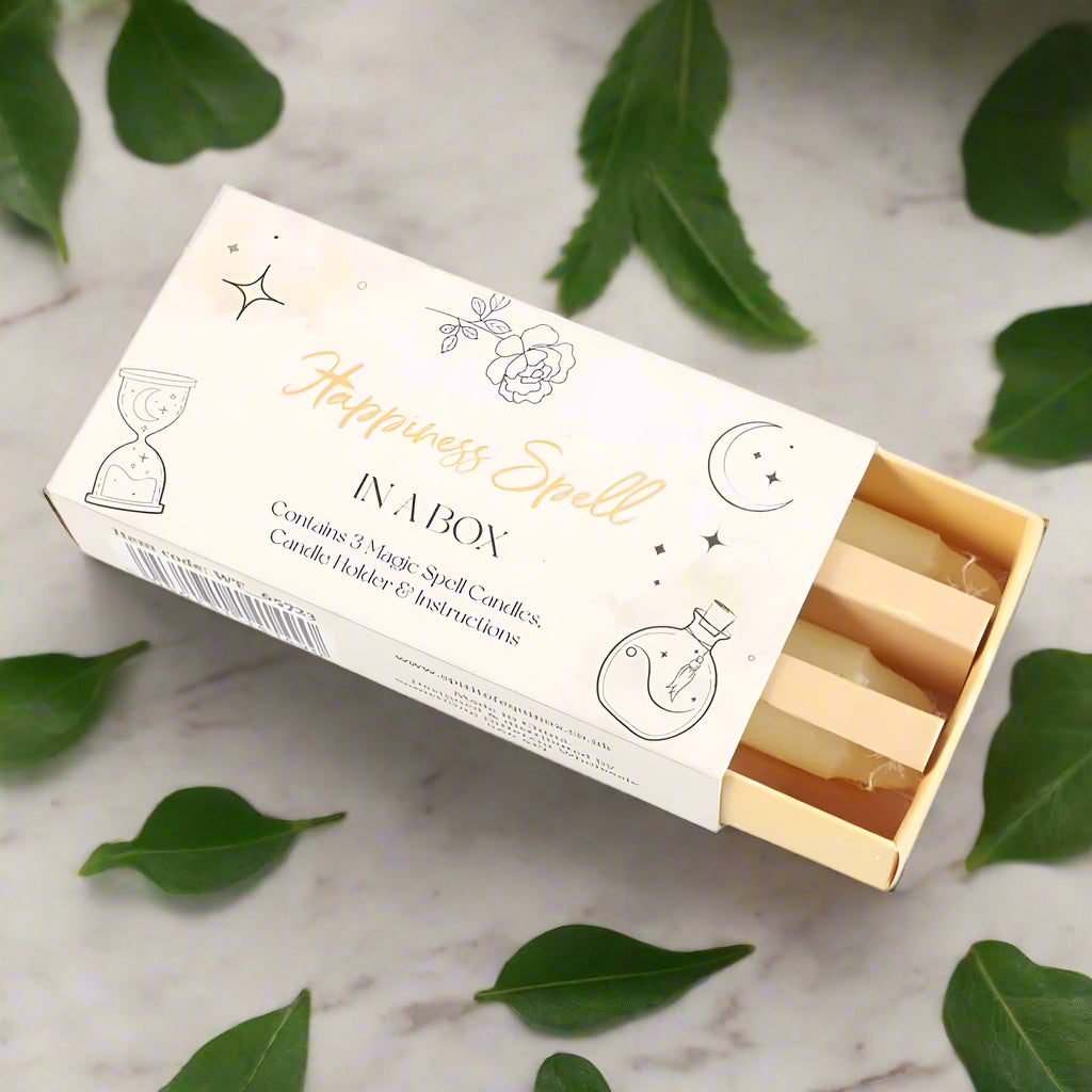 Use the 3 yellow spell candles included in the sliding box, which can also serve as a convenient candle holder. Let the magick of this happiness spell bring light and joy to your days!