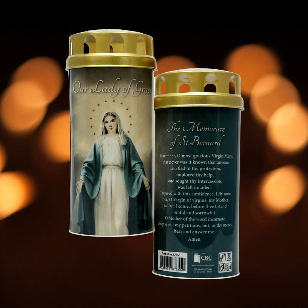 Illuminate your devotional experience with Our Lady of Grace LED Devotional Candle. Powered by 2 AA batteries, this elegantly designed candle features a stunning image of Our Lady of Grace on the front. Perfect for meditation, prayer, and adding a touch of sophistication to any space.