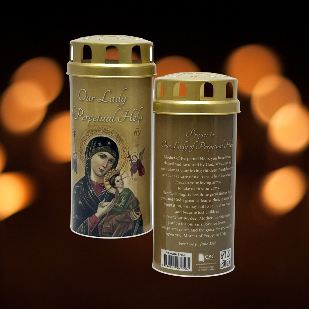 Indulge in the divinely crafted LED Devotional Candle featuring the image of Our Lady of Perpetual Help to guide you and powered by two AA batteries for your convenience.