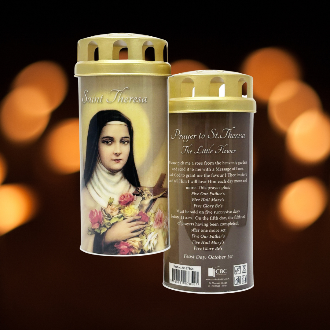 As you meditate, St Theresa's serene image will be illuminated by the soft glow of our LED devotional candle, creating an atmosphere of tranquility and elegance.